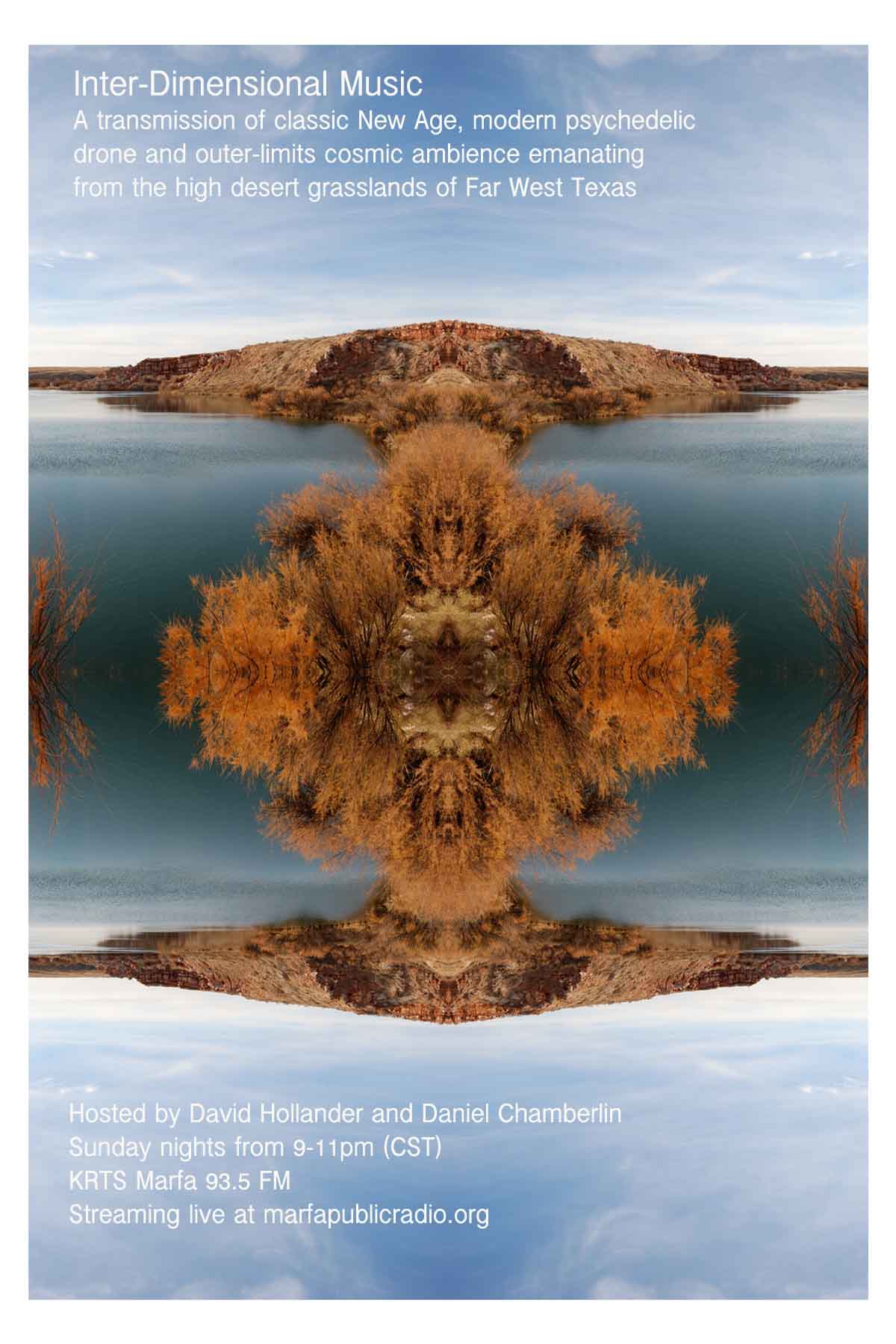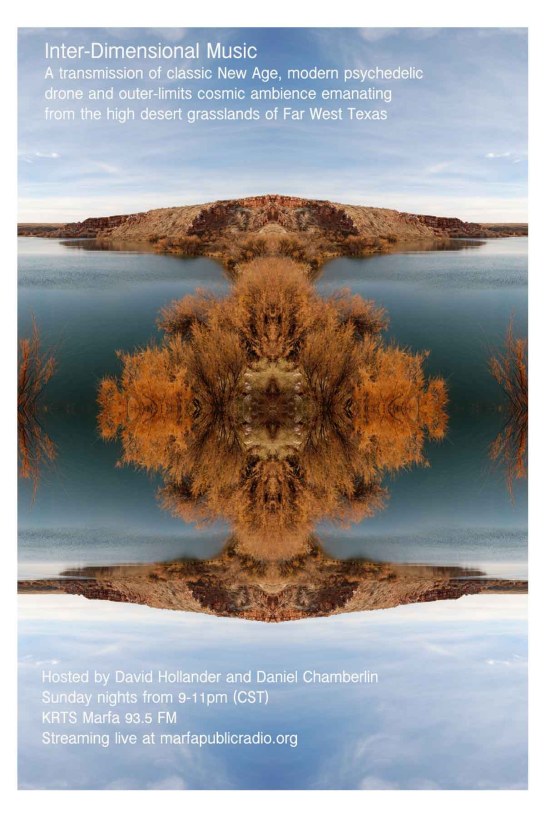 “Inter-Dimensional Music,” the New Age and earth-psych show that I host with David Hollander, floats through the Far West Texas air every Sunday night at 93.5 FM from 9-11pm (CST), and is often available streaming live online at marfapublicradio.org.