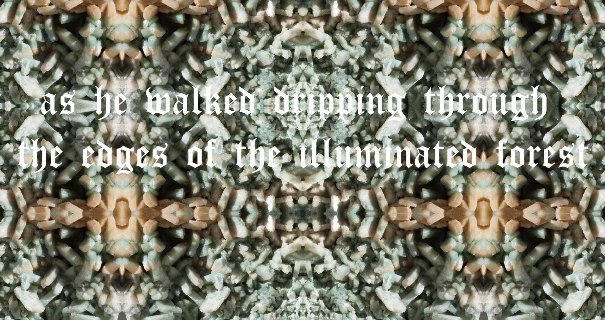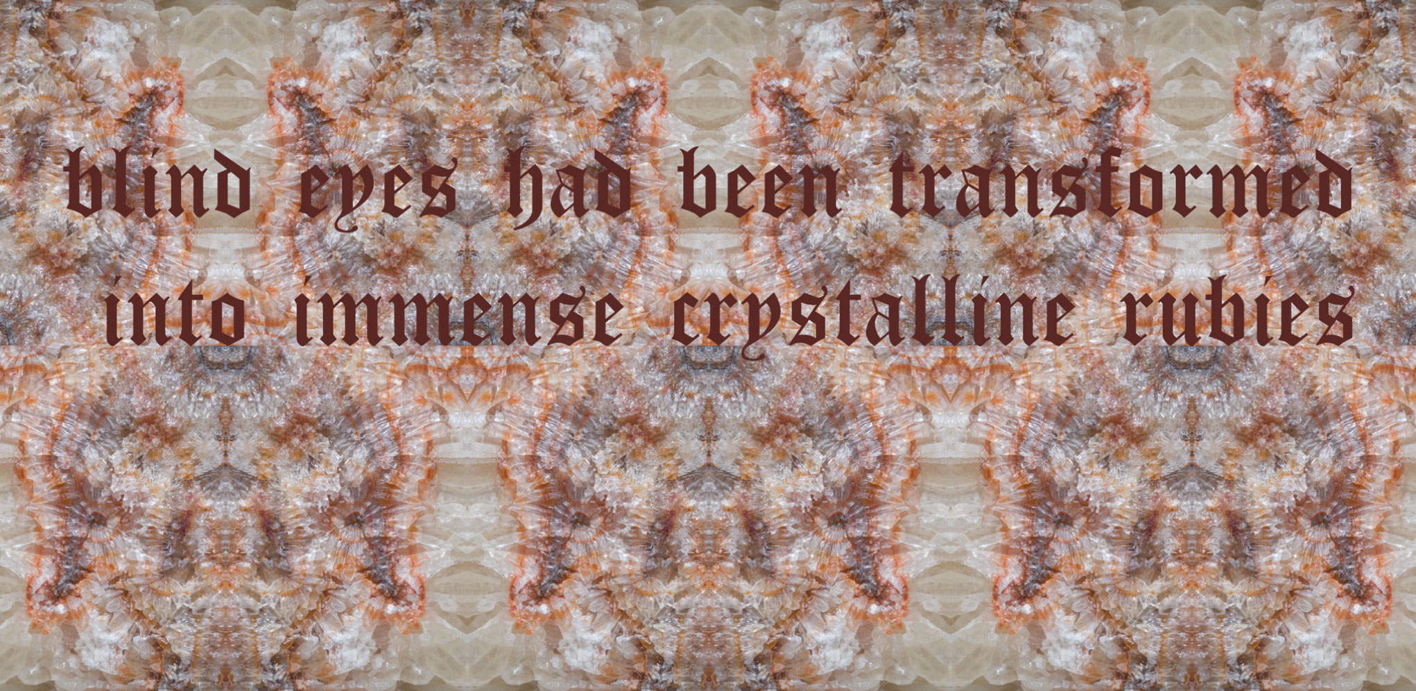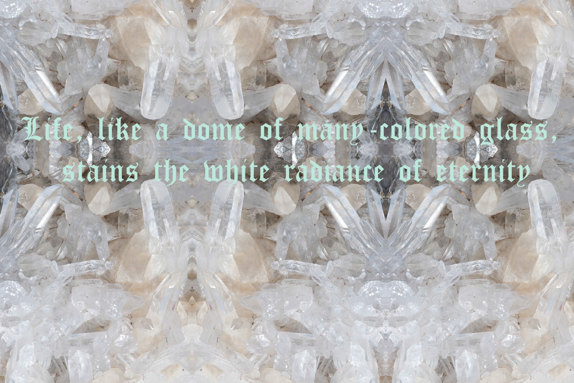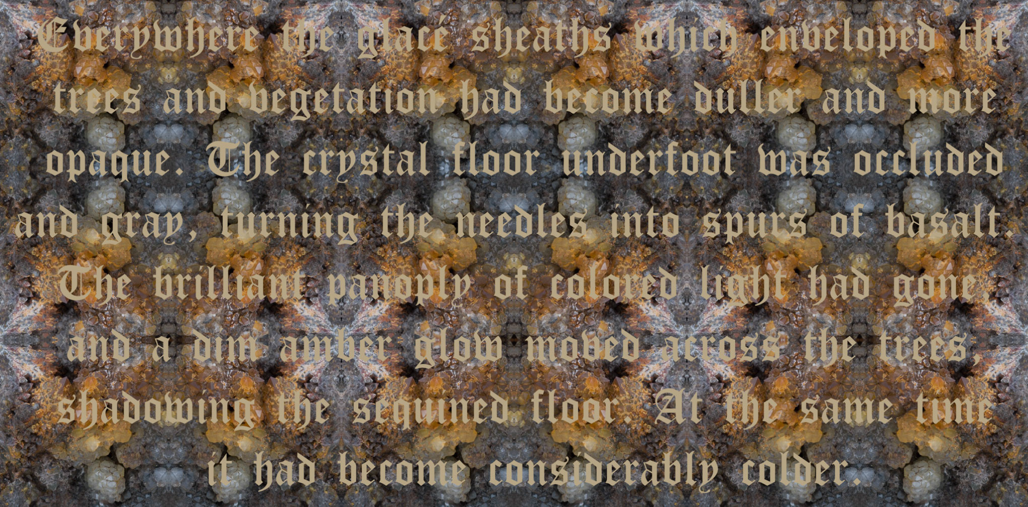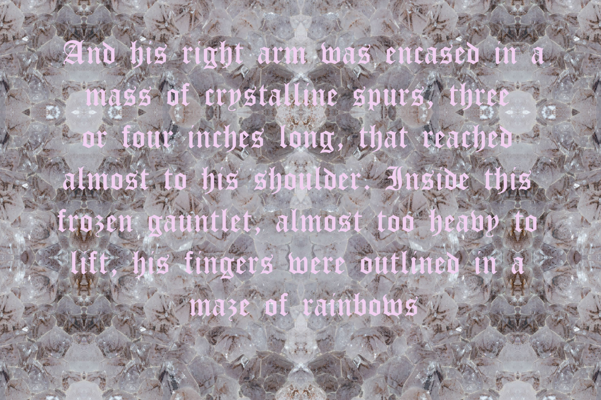 The Last Marriage of Space and Time is a new body of work from Marfa-based artist Daniel Chamberlin. Chamberlin’s collaged photographs of crystals and minerals are paired with text taken from J.G. Ballard’s The Crystal World (1966), including a line from Percy Bysshe Shelley’s Adonais, as quoted in the novel. The Crystal World is set in the riverside jungles of Gabon, and sits among Ballard’s natural disaster/apocalypse novels – see also: The Wind From Nowhere (1961), The Drowned World (1962) and The Drought (1964). It tells the story of a doctor traveling to a remote leper colony while contending with an environmental catastrophe in which life on Earth seems to be slowly succumbing to mass crystallization.