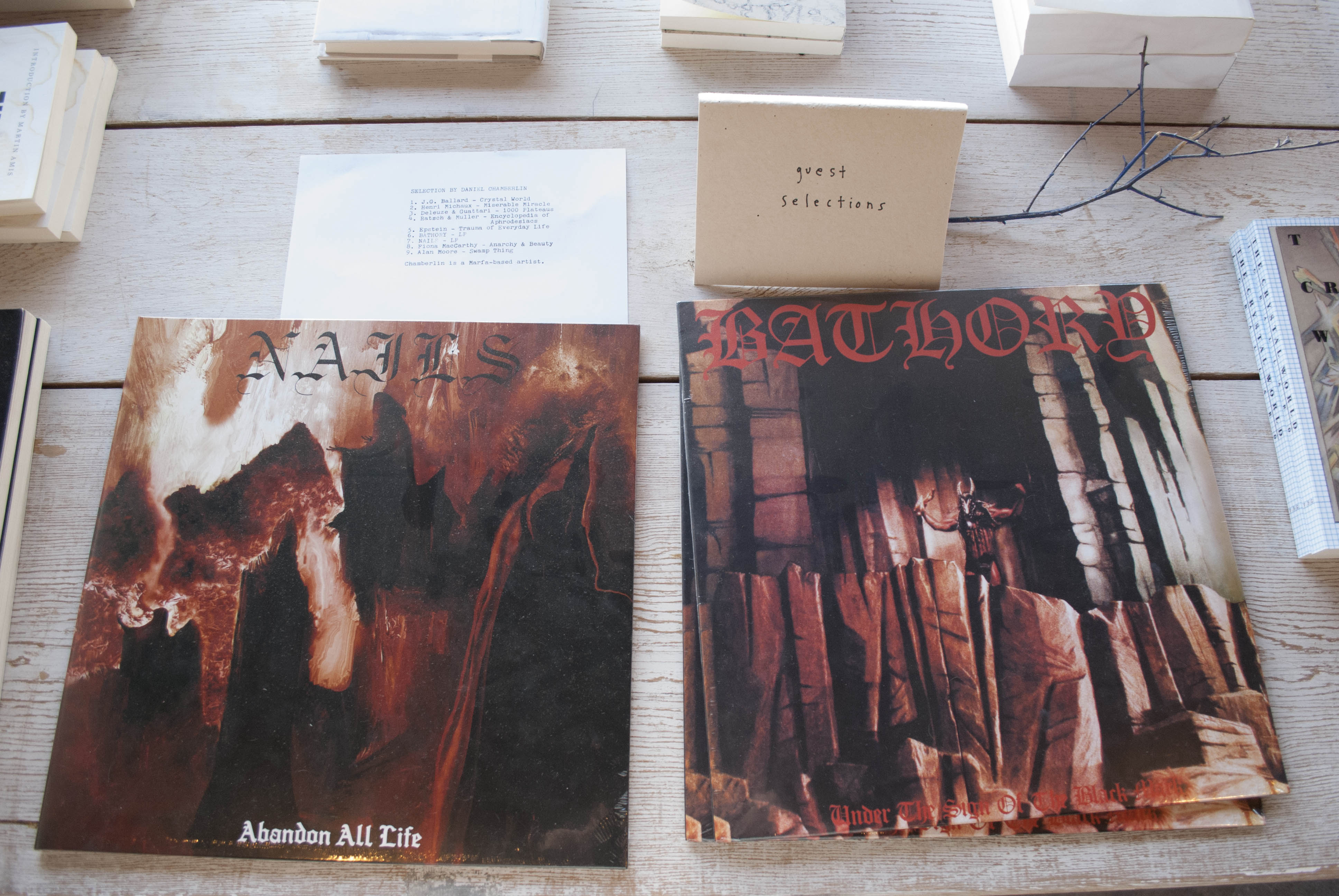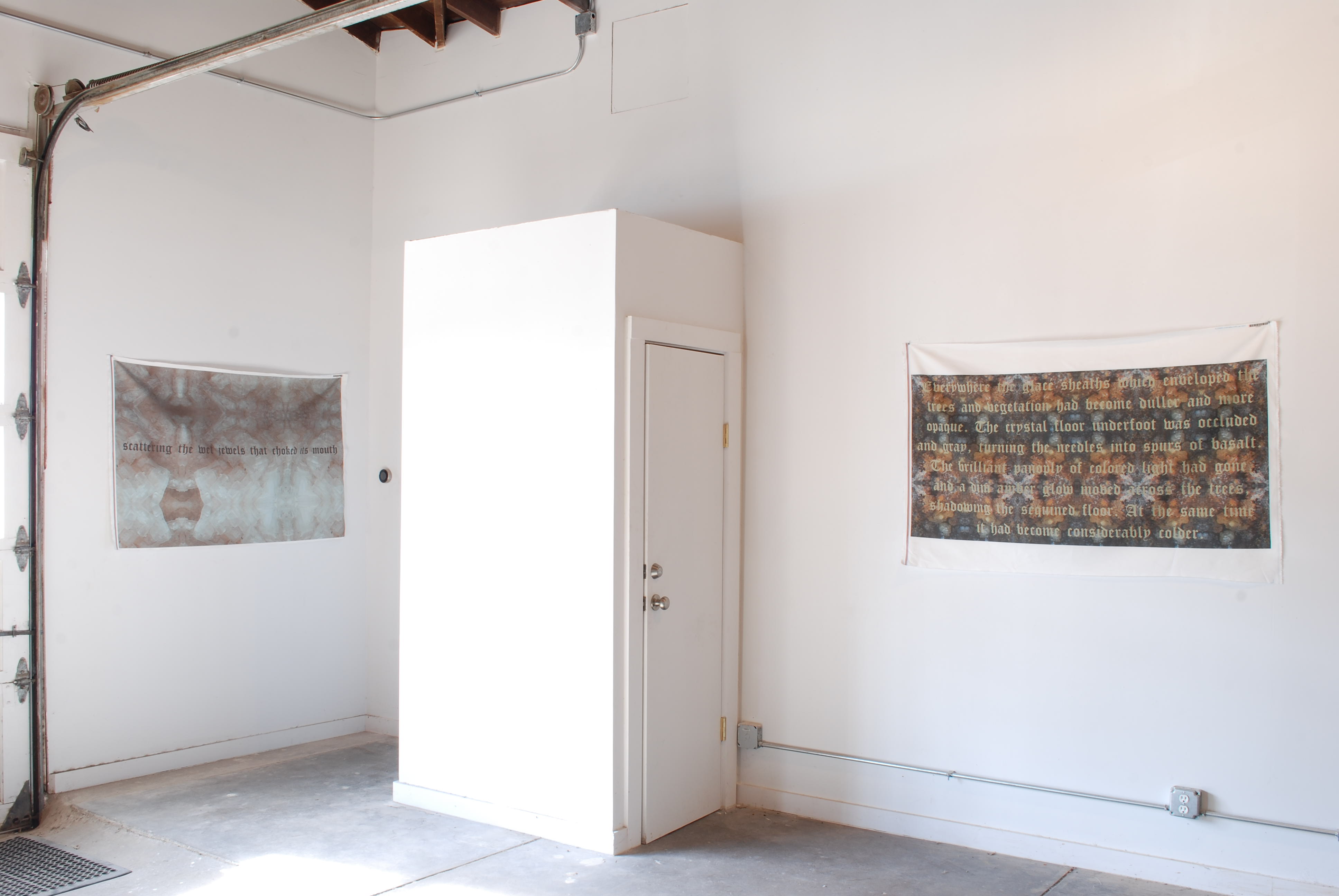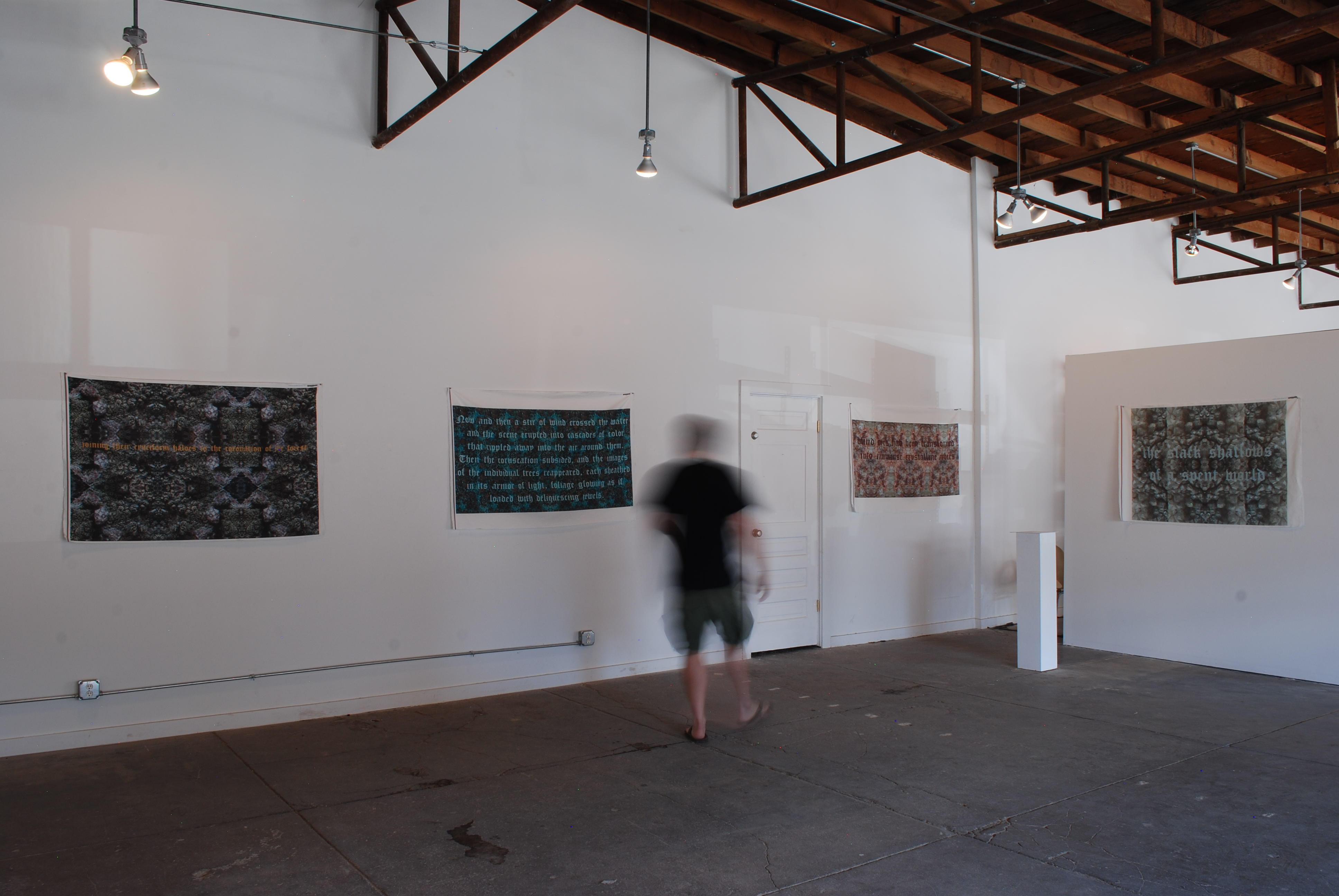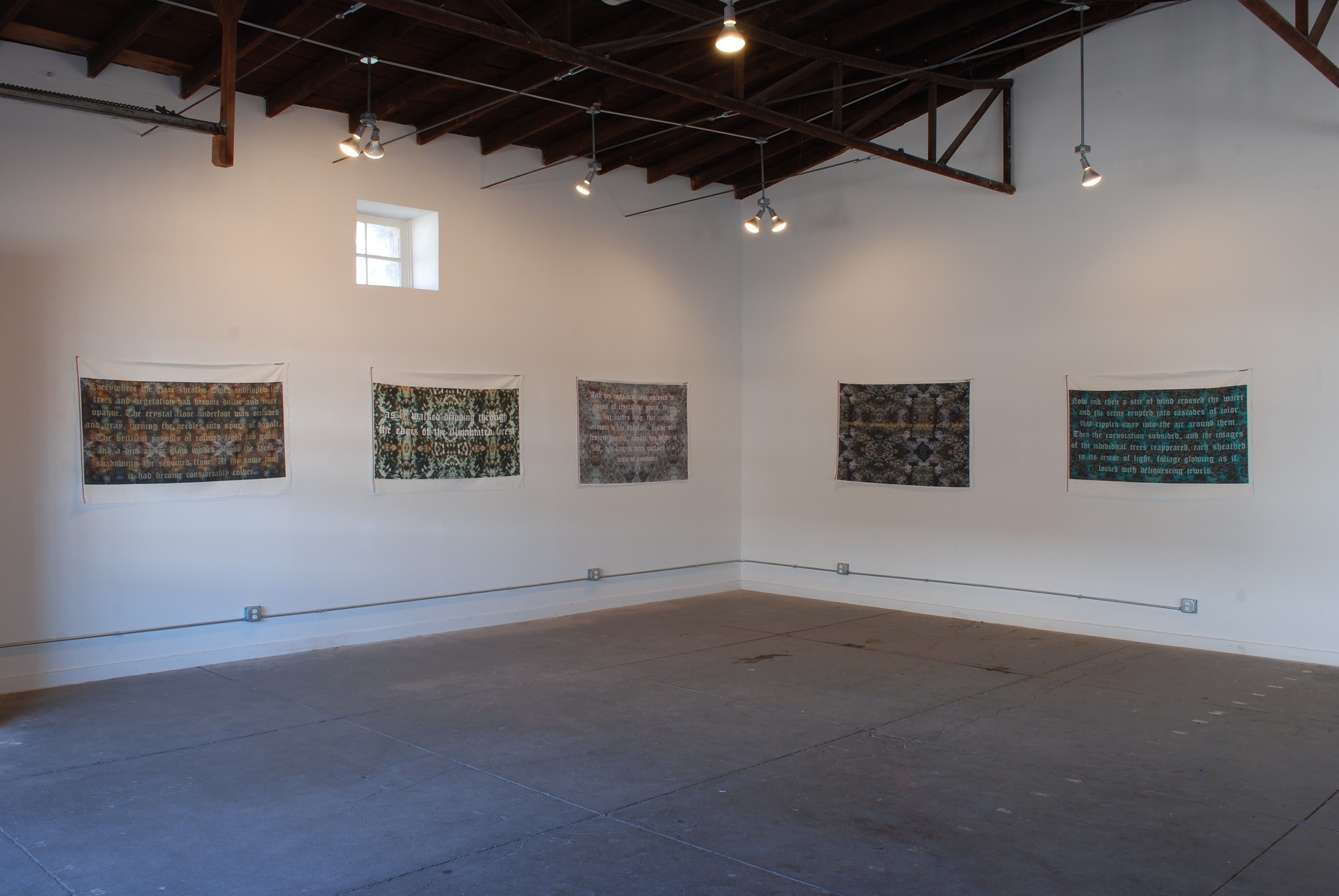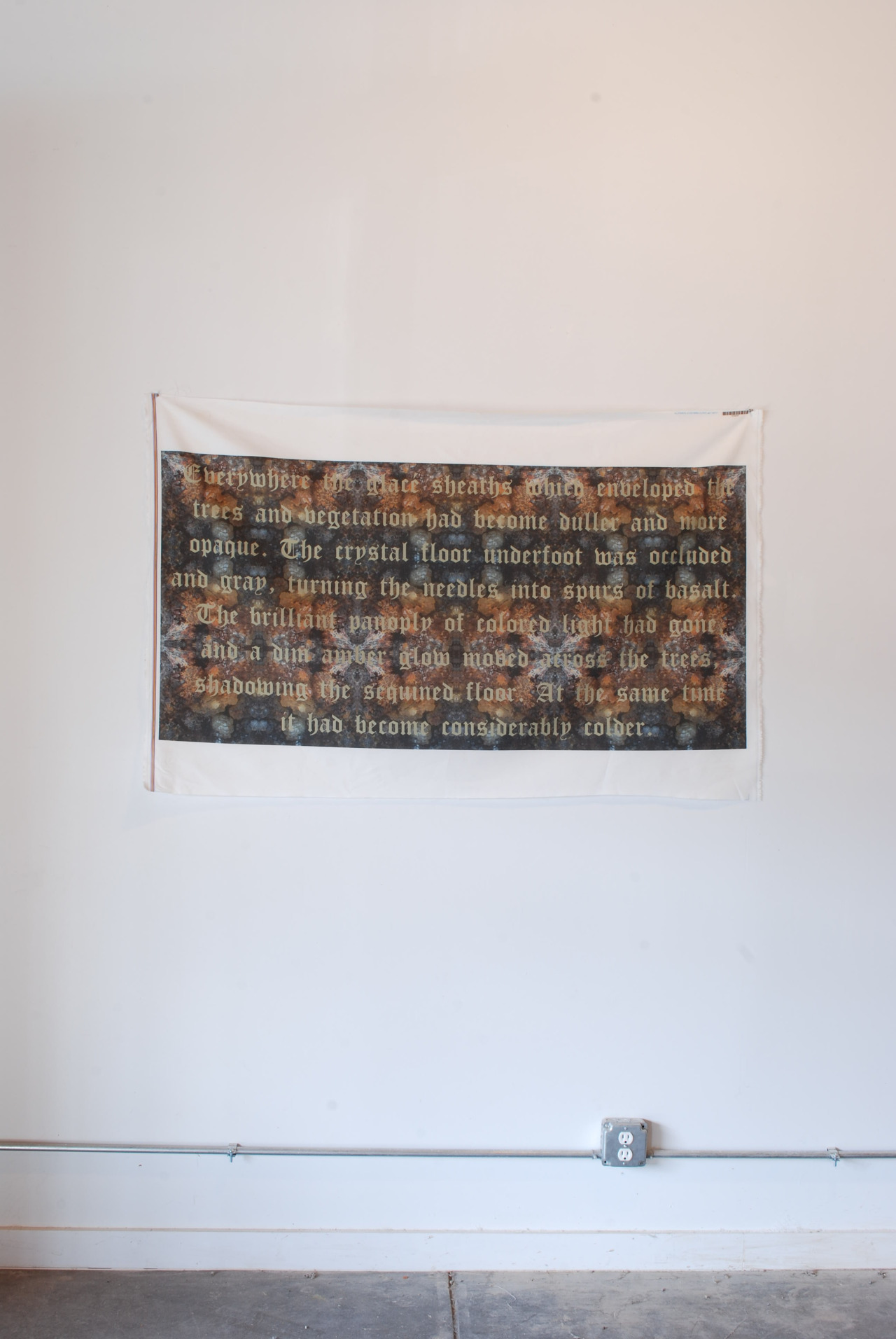 Chamberlin’s works feature language from the novel, and take inspiration from the designs of William Morris, the text-based work of Ed Ruscha, and the back patch textiles of the metal and punk communities. The wall hangings are printed on linen-cotton canvas; the typeface is Cloister Black, a font that originates in the early 1900s, but was adopted in the ‘80s and onward by metal bands such as Bathory, Burzum and Nails.