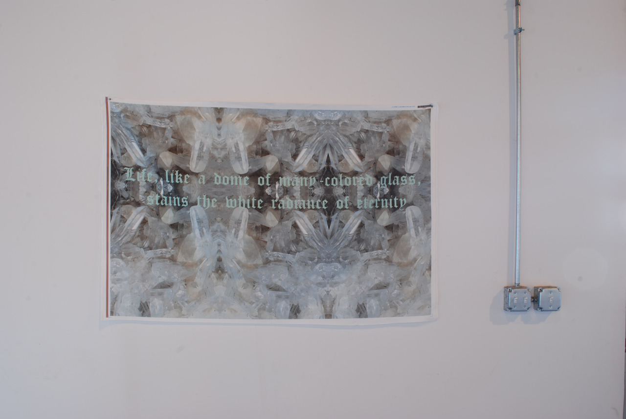 The Last Marriage of Space and Time is a new body of work from Marfa-based artist Daniel Chamberlin. Chamberlin’s collaged photographs of crystals and minerals are paired with text taken from J.G. Ballard’s The Crystal World (1966), including a line from Percy Bysshe Shelley’s Adonais, as quoted in the novel. The Crystal World is set in the riverside jungles of Gabon, and sits among Ballard’s natural disaster/apocalypse novels – see also: The Wind From Nowhere (1961), The Drowned World (1962) and The Drought (1964). It tells the story of a doctor traveling to a remote leper colony while contending with an environmental catastrophe in which life on Earth seems to be slowly succumbing to mass crystallization.