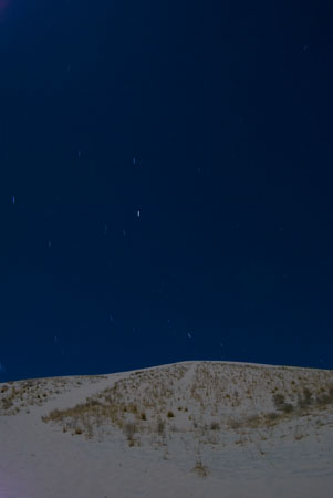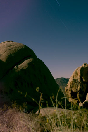 The Kelso Dunes are one of seven North American dune fields that produce “booming dunes.” The cascades of sand that walkers dislodge set off vibrations that sound like low-flying planes, and feel like standing front and center at a Sunn O))) show. We began our ascent after dark under a waning gibbous moon, our heads percolating with fifth kingdom remedies. Six hundred feet of elevation gain in shifting sand and howling wind took us around two hours. We descended in a fraction of the time, hooting and hollering as we tumbled down the dune’s face. A cold night sleeping in the open desert under a sky rippling with shades of deep purple followed.