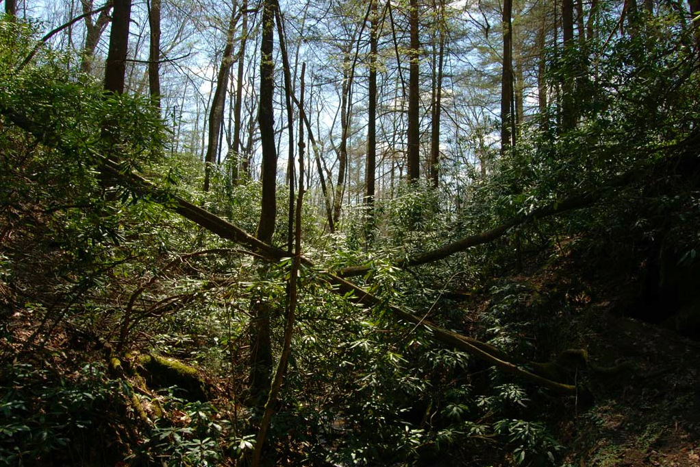 Within a preserve that in mid-2000 totaled 3055 acres, 2239 acres of little disturbed forest, encompassing an entire side of Pine Mountain. Communities include hemlock-mixed mesophytic, oak-pine, Appalachian oak (White Oak and Chestnut Oak most common but other species contributing), mountain bogs, cliffs, rock overhangs, and mountain streams. Pitch Pine dominates some areas; Shortleaf Pine and Virginia Pine are also present. The occurrence of pines is coincident with the driest forest at the summit. American Chestnut was once an important component but it all died in the 1930s and 1940s from blight. Traces of an old homestead can be seen at the mountain’s base, one part of the forest apparently underwent limited logging, cattle may have grazed a section, and someone tried to cut an off-road vehicle trail in a corner of the tract; but these activities did little noticeable damage.