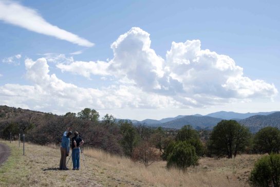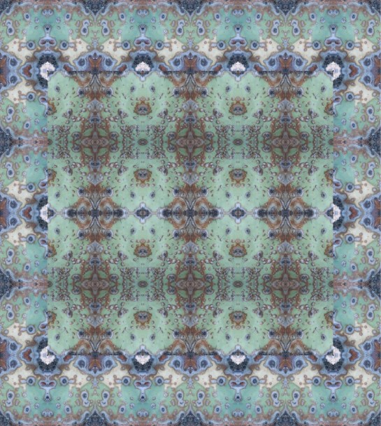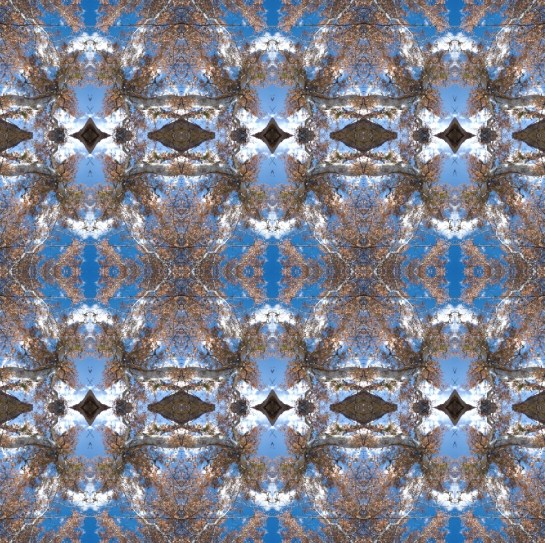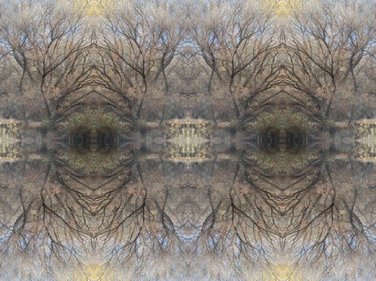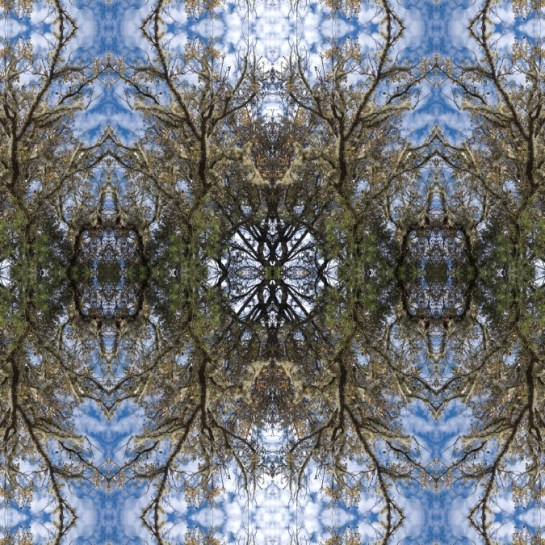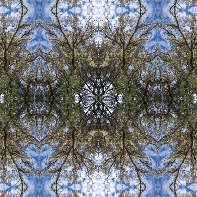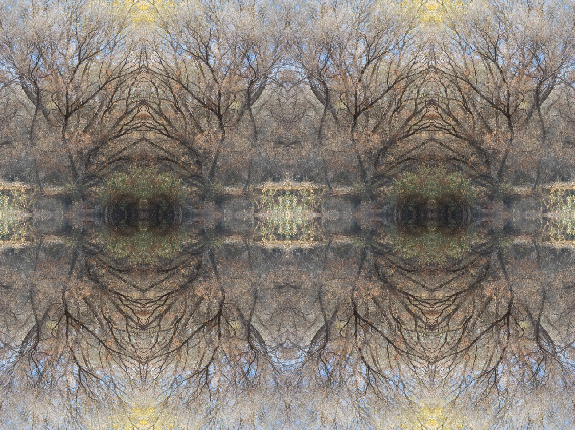 Several of the photographs in “Ecstatic Camouflage” were taken locally, in the Chisos Basin, and the Davis Mountains. Viewers may not immediately recognize these places however, and not just because the artist avoids iconic, monumental treatments for his subjects. In fact, the photographs resemble mandalas or yantras rather than icons or monuments. Curiously, his technique, involving minimal post-camera manipulation, does not hide the changes he makes, but demonstrates them openly. In the kaleidoscopic image that results from his repetitions and rotations, horizon lines vanish; trees and flowers, divide or merge; water appears throughout the surface; and the sky turns inward.